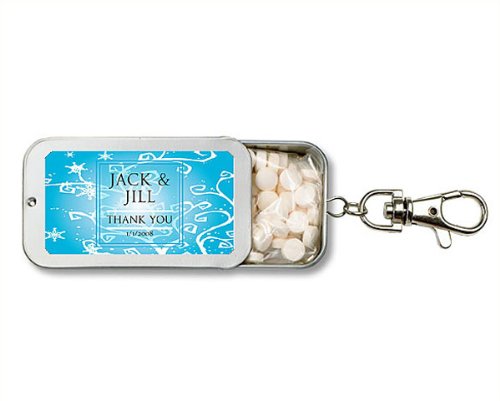 Wedding Favor - Bridal Shower Gift - Baby Shower Keepsake: This beautifully designed keychain mint tin makes the perfect favor ?" these flavorful mints are sure to leave your guests with fond memories of your event. The refreshing mints are packaged in a brushed tin container with a fun and practical key chain attachment along with a tin top that slides open to provide ready access to the mints.Further personalize your gifts with your names and event date along with your choice of one of our premium designs from our extensive design library. You are sure to find a design that perfectly complements your event theme and style. Measurements: 2.75 L x 1.5 W x 0.5 H Flavor: Cool Peppermint, Cinnamint, Refreshing Green Tea. Note: Tag or Sticker does not come attached to item.