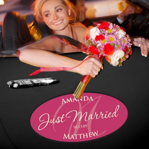 Wedding Favor - Bridal Shower Gift - Baby Shower Keepsake: Decorate your car with love with our Elegance Wedding Window Cling Personalized with your names, new initial and wedding date, this Just Married car cling will look incredible as you drive off into the distance. Then, after the wedding day is done, take this customized cling home and place it on your favorite window for a constant, daily reminder of the day you said, I do It's a great way to show off your love without breaking the bankFashioned in vinyl, these static cling decals will safely stick to most clean, smooth surfaces. Instruction sheet included. For best results, apply with water and remove with ease. Available in two sizes: Standard ST and Large LG. Large clings sold individually. Standard clings sold in sets of 2. Details: Size: Standard clings measures 12 inches by 6 inches. Large cling measures 22 inches by 11 inches. Materials: Static Cling VinylPersonalization Options: The Elegance Wedding Window Cling may be personalized with two block first names max of 12 characters per name, a numeric date and a single script initial, which will be placed largely in the background with your choice of a cloud, aqua, sage, wisteria, petal pink, raspberry, wineberry, plum, claret, tangerine, chocolate, grey, black, burnt sienna, cinnamon, blueberry or ice blue background at No Additional Cost. *Please Note: Personalization ink varies with background color. See More Photos for samples and script initial font chart.