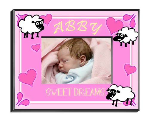 Your favorite baa-by will look adorable framed by these smiling cartoon sheep and pretty pink hearts. Ideal for the little one`s nursery or as a personalized gift for Mom and Dad`s room. Frame measures 8 x 10 and holds a 4 x 6 photo. First Name 15 Characters Bottom Text to replace Sweet Dreams - 20 characters ... This unique & elegant item is part of our exclusive Wedding Favor and Bridal - Baby Shower collection. They make for a great and unique gift for your wedding reception, bridal shower, bay shower or any other special event.