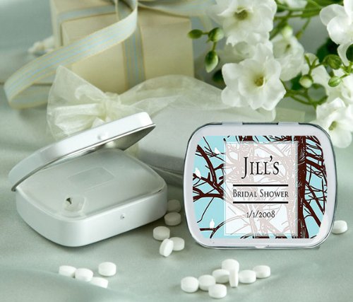 Wedding Favor - Bridal Shower Gift - Baby Shower Keepsake: These elegant hinged mint boxes are finished in an attractive gloss white color and are sure to provide a tasty treat for your guests.The tins are filled mints with a refreshing peppermint flavor a real crowd pleaser.The tins are sealed with a clear wrap around the side of the container.Personalize each mint box with your name, event date and an illustration from our extensive design library.You are sure to find a design that perfectly complements your event theme and style. Mints are sugar free Mint Box Size: 2 3 8 long x nearly 2 wide and 5 8 high Weight: 1.4 ounces. Note: Tag or Sticker does not come attached to item.