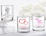 Personalized favors are memorable keepsakes for your guests and will guarantee that your event will not be forgotten! These favors can be used as either votive holders or as shot glasses. Whether you're headed to Vegas, honeymooning in Paris, or throwing a baby shower for your best friend, they can be imprinted with a variety of graphics that will work for just about any theme! Include names and event date to make the personalization complete. Choose from many different designs (see selections below) and 9 different color options. Due to personalization, there is a minimum order of 48 on this item, and will ship in approx. 2-3 weeks. View wedding design options hereView baby shower options here