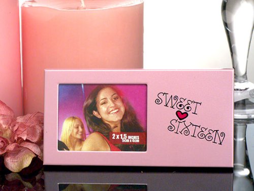 From our "She's So Sweet" collection. Your sweet 16 only once but with these photo frame favors your memories can last a lifetime. A Favor Warehouse exclusive design. Each pink metal frame has a hand painted heart with the words "sweet sixteen". They measure 2" x 4" and hold a 2"x1.5" photo. They come in a black bottom gift box with a clear top. The shipping weight is 0.10 lbs per piece.