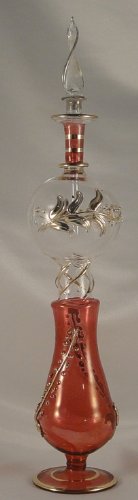 Direct Import from Egypt. ------------ Dating back to 30 B.C., these bottles still grace Pharaoh's tombs in the valley of the kings. Today these functional perfume bottles may be filled with scented oils, bath fragrances, or just represent a beautiful addition to any cherished collections. Egypt has a proud and continuing tradition of glass blowing. Each perfume bottle is a mouth blown masterpiece: hand-etched & hand-painted. Highlighted with 9K Gold, each piece is an incomparable, unique and one of a kind gift. ------------- We carry a wide selection of colors and sizes of these unique Egyptian Perfume Bottles. Treat yourself to this item or give it as a gift.