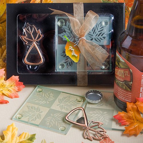 Wedding Favor - Bridal Shower Gift - Baby Shower Keepsake: These leaf design bar sets set the bar high as autumn favors that are handy the whole year through Looking for useful favors that are sure to please? Well, at Fashioncraft, we think bar sets - like these dynamic leaf design bottle opener and coaster duos - are a spirited choice. And we know you'll agree once you see your guests "fall" in love with them Description and details: Copper colored metal bottle opener measures 2.75" x 1.25" and has a realistic cut out leaf design top and bottle opener base Two 3.5" square glass coasters, each with an etched four block design - alternating white and clear background and white and clear maple leaf designs Perfect as autumn favors for fall events of all kinds Packaged in a black two piece box with a clear acetate window, wrapped and tied with a copper organza ribbon and an attached leaf design "For You" tag
