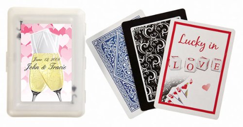 These exclusive design, premium, playing cards are a sure bet to put a smile on your guests faces. Our cards are packaged in a practical, translucent gift box that makes for a pretty presentation for your guests. Choose a design from our extensive design library and personalize the box cards are not personalized with 2-3 lines of text to include your names, event date and if you wish a fun phrase e.g., Perfect Pair, Two of a Kind. etc. Dimensions: Decks measure 2 3 4 x 4 in. Weight: 0.35 lbs each. Note: Tag or Sticker does not come attached to item. ... This unique & elegant item is part of our exclusive Wedding Favor and Bridal - Baby Shower collection. They make for a great and unique gift for your wedding reception, bridal shower, bay shower or any other special event.