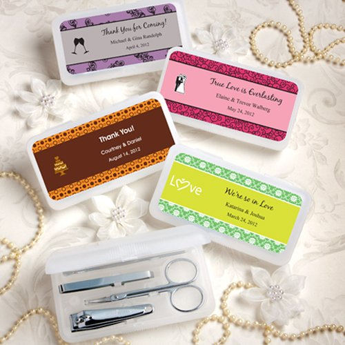 Choose these Design Your Own Collection travel manicure sets as useful favors that let your personality shine through Fashioncraft's exclusive Design Your Own Collection of personalized favors makes it easy and fun to be creative with your one-of-a-kind favor choice. And, with this travel manicure set, your uniquely-you favor will also be exceptionally useful and a cut above the rest! Each favor measures 3.75" x 2". Sticker size is 3.35" X 1.5" Travel manicure set includes four all-metal tools, including a cuticle pusher, tweezers, nail scissors and nail clipper Set is conveniently contained in a clear hard molded plastic box with hinged opening - great to have with you in your suitcase or purse Box is perfectly sized for a personalized label with designs/themes for all occasions including weddings, showers, Christenings, Sweet Sixteens and more Choose from an exceptional selection of color combinations, border styles, titles and type styles for your customized labels Preview your unique label online as you design it - so you'll be sure it's exactly what you want Personalized pre-cut label sheets come ready for easy application on the top of the kit Packed in a poly bag Please allow 2-3 days for processing