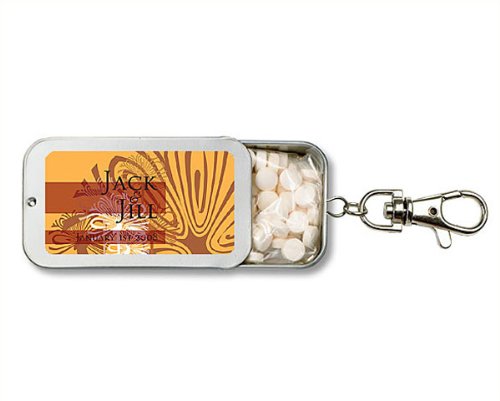 Wedding Favor - Bridal Shower Gift - Baby Shower Keepsake: This beautifully designed keychain mint tin makes the perfect favor ?" these flavorful mints are sure to leave your guests with fond memories of your event. The refreshing mints are packaged in a brushed tin container with a fun and practical key chain attachment along with a tin top that slides open to provide ready access to the mints.Further personalize your gifts with your names and event date along with your choice of one of our premium designs from our extensive design library. You are sure to find a design that perfectly complements your event theme and style. Measurements: 2.75 L x 1.5 W x 0.5 H Flavor: Cool Peppermint, Cinnamint, Refreshing Green Tea. Note: Tag or Sticker does not come attached to item.
