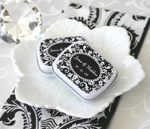 These retro chic Damask Tins can show off your hip and modern style. Guests can easily slip them into their pocket or purse. You can choose the color on the label to match the scheme of your wedding. Tins come personalized with your names and message OR they can be printed with your 3 letter Monogram (please choose one option or the other). MINTS ARE NOT INCLUDED; you are free to fill them as you wish. Tins arrive separate from the labels. Some assembly required (attaching the self-stick labels to the tins). Due to the personalization for this product the minimum order is 24. Size: 2.25" x 1.75" x .57".