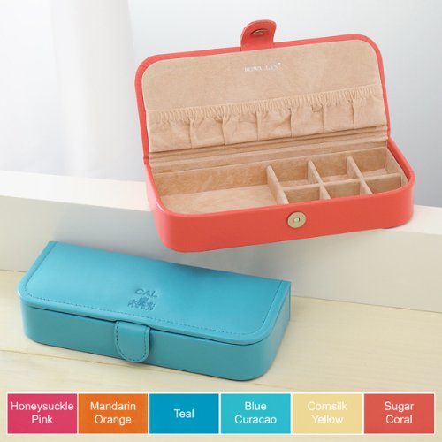 Use our Personalized Leather Jewelry Box at home atop any dresser or vanity, or as a take away travel case when on the go. This well-designed jewelry keep boasts six earring ring compartments, one larger compartment for bracelets and necklaces, and a gathered pouch on the lid for storing more delicate pieces. The well-structured case, with micro-sueded lining will easily become a statement piece no matter where you use it. Available in Honeysuckle Pink P, Mandarin Orange OR, Teal T, Blue Curacao B, Cornsilk Yellow Y, and Sugar Coral C. Details: Size: Measures 8 by 3.25 by 1.25 inches. Materials: LeatherPersonalization Options: The Leather Cuff Link and Jewelry Box may be debossed with up to three block initials centered on the exterior flap at No Additional Cost. ... This unique & elegant item is part of our exclusive Wedding Favor and Bridal - Baby Shower collection. They make for a great and unique gift for your wedding reception, bridal shower, bay shower or any other special event.