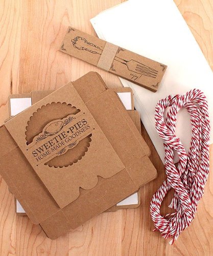 Our "Sweetie Pies" kit includes everything you will need to wrap up 20 mini pies in nostelgic retro style. Kits include boxes, tags, wax sheets and pre-cut twine. Creates a charming presentation for home-made or store-bought miniture pies your guests will truly enjoy.