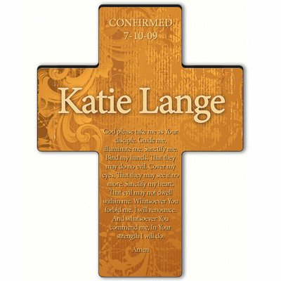 Celebrate God?TMs grace with this elegant gold-toned personalized cross, decorated with flowers and swirls and one of nine prayers, suitable for a variety of religious occasions, including baptism, Holy Communion, confirmation, or marriage. A lovely addition to any room, our Gardens of Grace personalized cross includes the name of the recipient, printed on a long-lasting composite material. Stand included. Cross measures 6 3 4 x 5 1 8 x 1 4. Stand measures 1 3 4 in diameter and stands 3 4 tall. Select prayer and personalize with a name of up to 20 characters, an event of up to 15 characters and date MM-DD-YY format. PRAYER TEXT: God please take me as Your disciple. Guide me, illuminate me, Sanctify me. Bind my hands, That they may do no evil. Cover my eyes, That they may see it no more. Sanctify my heart, That evil may not dwell within me. Whatsoever You forbid me, I will renounce. And whatsoever You commend me, In Your strength I will do. Amen. ... This unique & elegant item is part of our exclusive Wedding Favor and Bridal - Baby Shower collection. They make for a great and unique gift for your wedding reception, bridal shower, bay shower or any other special event.