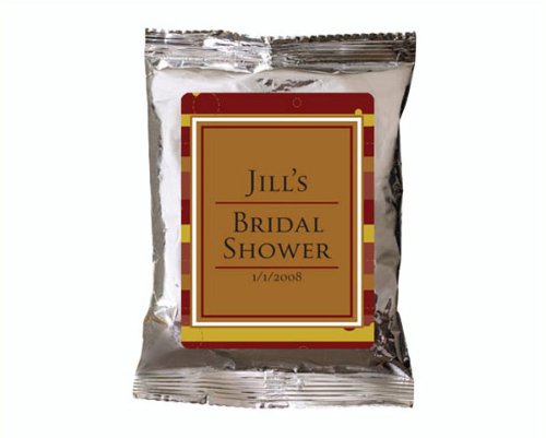 This frothy, iced cappuccino drink is sure to be a rich and refreshing guest pleaser. The single serving pouches are sealed in elegant silver pouches which can be personalized with your names and event date along with your choice of one of our premium designs from our extensive design library. You are sure to find a design that perfectly complements your event theme and style. Package Contents: single serving 1 oz package of cappuccino powder Package Size: 4 wide x 6.5 tall Instructions: Just add milk or water and pour over ice. Note: Tag or Sticker does not come attached to item. ... This unique & elegant item is part of our exclusive Wedding Favor and Bridal - Baby Shower collection. They make for a great and unique gift for your wedding reception, bridal shower, bay shower or any other special event.