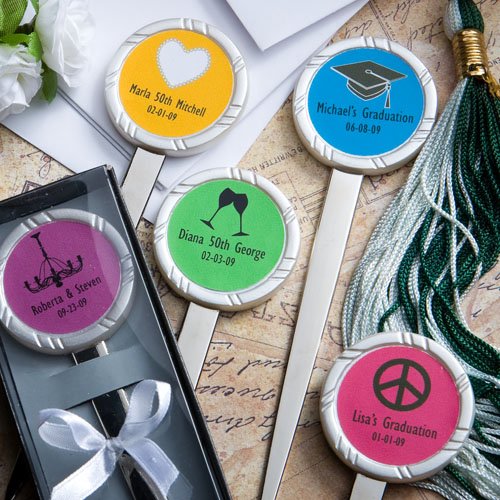 Customize your celebration with these Personalized Expressions Collection letter opener favors It's easy to celebrate your unique style with these Personalized Expressions Collection letter opener favors from Fashioncraft. Whatever the occasion - a wedding, Sweet Sixteen, shower, anniversary or any other special event - these favors make it all your own! Each measures 5" x 1.5"" and has a silver metal opener blade attached to a round white poly resin charm with a grooved pattern rim and an inset center fit for easy application of the personalized peel and stick label of your choice. From assorted color combinations, to seasonal and themed designs, to your own title, you design the eye catching label that suits your style! Each comes packaged in a clear topped box with a black base and silver insert, finished with an attached white satin bow. Please allow 3-4 days for production.