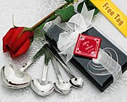 A proven choice with wedding guests, our heart measuring spoons are Kate Aspen originals. These high-quality stainless steel spoons are inscribed with "measures of love" on one side and standard measurements on the other. Whenever your guests measure their ingredients, they're sure to smile at the warm message engraved on each spoon. The featured "measures of love" are: "A Pinch of Patience," "A Dash of Kindness," "A Spoonful of Laughter" and "A Heap of Love." The complete set is displayed in a classy, velvet-lined package with clear top measuring 6" x 2". A sheer organza bow tied around the box is coupled with a tag reading "Love Beyond Measure." This favor also features personalized tags; your guests are sure to love this wedding favor for years to come!