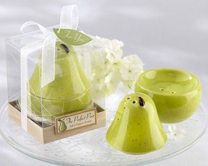 Some of life's most enduring things come in pairs, like couples in love and salt-and-pepper shakers. Kate Aspen believes salt and pepper should come in pears , too, so we created "The Perfect Pair" Salt & Pepper Shaker. It's the pear -fect gift for your wedding or bridal shower guests! Features and facts: Top half of pear-green, ceramic pear is a salt shaker, and the bottom half is a pepper shaker A tiny, dark-brown stem accents the top of the salt shaker Pear measures approximately 3 " h x 2 " in diameter Ceramic pear sets in a bed of natural, shredded raffia on a faux-wood base inside a clear gift box Gift box is accented with a sheer white, organza ribbon and bow with a green, leaf-shaped "For You" tag and a small, raised plaque with a tiny, green pear and the words The Perfect Pear Salt & Pepper Shaker on the front of the base Gift box measures 3" h x 2 " w x 2 " d Mix and match with "The Perfect Pair" Pear Kitchen Timer and "The Perfect Pair" Refrigerator Magnet and "The Perfect Pair" Cookie Cutters