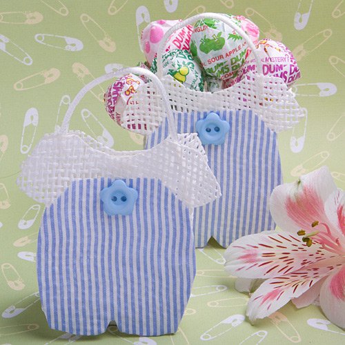 Wedding Favor - Bridal Shower Gift - Baby Shower Keepsake: Oh baby...for your little boy`s special event, this one`s a winner What snuggly little piece of clothing is reserved just for babies? Well it`s the one of course So, with little boys` baby showers, Christenings and more in mind, Fashioncraft, took the absolutely adorable shape and made it into an absolutely adorable favor. And, you get to fill it up with treats galore. Description and details: Each measures 3 x 3 White woven rattan bag in the shape of a cute little boy`s outfit with a blue and white striped cotton material bottom and a blue button accent The bag has a white handle and a Velcro piece that seals the top Have fun filling these great bags with candy, soaps, or whatever your heart desires Packaged in a clear poly bag