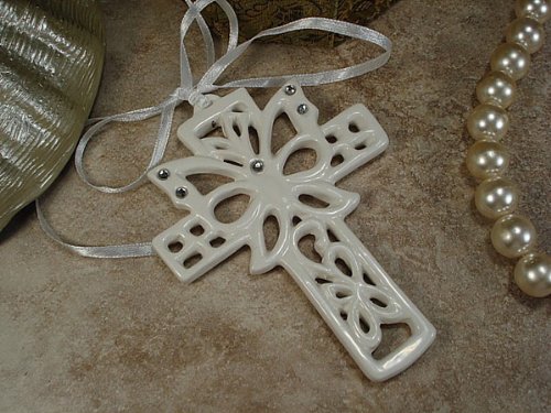 Wedding Favor - Bridal Shower Gift - Baby Shower Keepsake: Absolutely gorgeous The pure elegance of this beautifully rhinestone accented porcelain hanging cross ornament will leave your guests completely impressed. The delicate glazed ivory color porcelain work in combination with the clear handplaced rhinestones make this an ideal favor for almost any occasion. Rhinestones are on both sides of ornament. Comes complete with white satin hanging ribbon. By D`Lusso Home Collections. Comes packaged in a matte ivory color gift box. Weighs .3 lbs. Measures: 4H x 3.5W