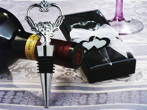 If you want to give a favor that is truly unique, then this is the favor for you. these wine stopper favors double as bottle openers as well, the chrome metal intricate heart top is attached to a metal base. your guests will be impressed with these stylish two in one favors. best of all they are ready for gift giving, they come packaged in an elegant black gift box with velvet lining wrapped with an organza ribbon, and heart shaped thank you tag. each favor measures 5" long.