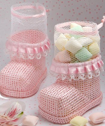Filled with treats or little treasures and oh-so-cute, your guests are sure to get hoots out of these pink baby bootsThink of the smiles you'll see when your guests arrive and find these adorable Fashioncraft exclusive bag favors shaped like pink baby booties filled with goodies. And, they'll surely recognize all the thought and love you put into the preparations for your baby girl's big day.Description and details: Each measures 3" x 3"Pink woven rattan bag in the shape of a cute little girl's bootie with a pink satin ruffle and white lace accentThe top of the bootie has white tool netting and a pink stain pull string for closure Have fun filling these great bags with candy, soaps, or whatever your heart desiresPackaged in a clear poly bag