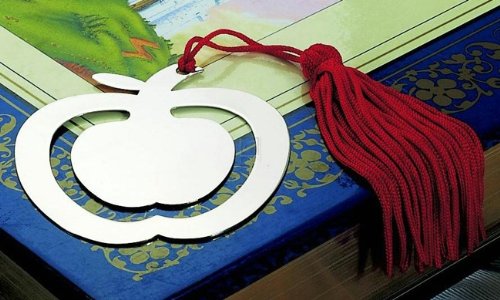 The Detailed Description of APPLE BOOKMARK W/ RED TASSEL, NICKEL PLATED.Features