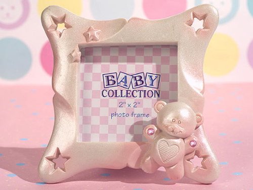 Oh how cute! These cute and cuddly teddy bear photo frame favors will be adored by your guests. This adorable designed pink resin teddy bear frame is highlighted with star shaped cut outs in each corner and accented with two perfectly placed pink crystal stones. Each time your guests look at these frame favors they will be reminded of fond memories of your picture perfect day. Each Favor Warehouse exclusive teddy bear frame measures 3" x 3" and holds a 2 x 2 size photo and comes in a white gift box.
