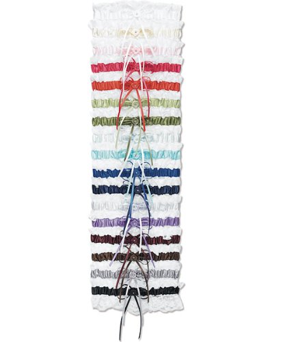 Choose from a variety of fashionable colors, for the Bridal Toss" Garter. An elasticized colored ribbon band is trimmed with white lace and features a matching ribbon rose with rhinestone center and delicate bow.