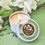 Cherry blossoms have long been known throughout the world as a symbol for spirituality and feminine beauty. These Cherry Blossom Personalized Travel Candle Tins will retain their tradition while making your event look fabulous! These cherry blossom themed candle tins offer a round shape, the perfect housing for our elegant 2 oz. candles. The tins themselves feature a bold label, which you can customize in a variety of colors and designs to invoke whatever theme or style you want, making for the perfect addition to travel or honeymoon-themed bridal showers or receptions. Cherry blossoms are so simple, but nothing quite compares to their subtle class. The cherry blossom themed candle tins come personalized with your names and wedding date or personal message. Tins arrive separate from labels. Candle Tins emit a subtle floral fragrance. Some assembly required by means of affixing labels to tins. Due to personalization for this product, the minimum order is 24. Size: 1.3" x 2" Max. Characters per line (including spaces): Line 1: 16 Characters Line 2: 14 Characters