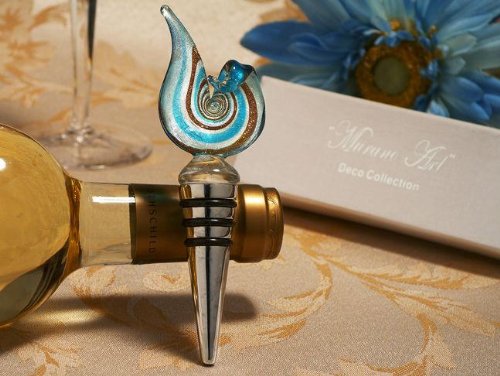Inspired by the artisans of murano italy, these handcrafted murano like glass bottle stoppers are stunning and will wow your guests with it's elegance and style. from cassiani collections exclusive murano art deco collection this stylish swirl design handmade venetian like glass wine stopper is made of elegant blue, gold , and silver colored glass and is attached to a solid chrome metal base. this favor is sure to impress your guest with it's sophistication and elegant design. each of these unique art deco bottle stoppers are handmade and because of that no two are exactly alike. they come packaged in high quality two piece white gift box and set in a soft satin lining. each stopper measure approximately 5" in length.