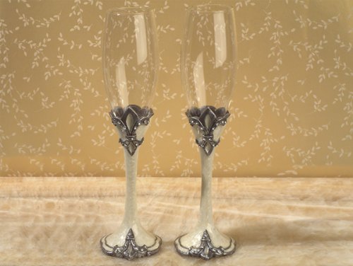 Wedding Favor - Bridal Shower Gift - Baby Shower Keepsake: Let's celebrate and toast the guests of honor. From Cassiani collections exclusive Sophisticated ivory Fleur de lis accessories collection, these toasting flutes are made of a sculpted Fleur de lis design resin base with glass flutes attached and are accented with crystals and an elegant ivory epoxy enamel finish. The perfect accessory to compliment your glamorous evening . Each set of flutes comes packaged in lovely display gift box and measures approximately 10" high.