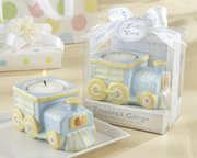 All aboard for one of Kate Aspen's most adorable baby shower favors! Choo-choo choose the "Precious Cargo" Train Tea Light Holder, and you'll be on track to thank your guests with a charming gift that carries the warm glow of pleasant memories from the shower to a shelf at home. Features and facts:Colorful, ceramic choo-choo train tea light holder in pastels of blue, yellow and green with white accentsTea light measures 2" h x 3 " w x 2 " dFavor presentation includes clear gift box with color-coordinated base and a background with choo-choo-train smoke clouds, White-satin ribbon and bow imprinted with light-green border and blue "choo-choo," and a round "For You" tagGift box measures 4 " h x 3 " w x 2 " d