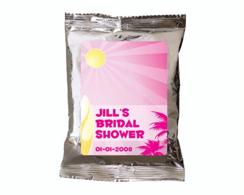 This frothy, iced cappuccino drink is sure to be a rich and refreshing guest pleaser. The single serving pouches are sealed in elegant silver pouches which can be personalized with your names and event date along with your choice of one of our premium designs from our extensive design library. You are sure to find a design that perfectly complements your event theme and style. Package Contents: single serving 1 oz package of cappuccino powder Package Size: 4 wide x 6.5 tall Instructions: Just add milk or water and pour over ice. Note: Tag or Sticker does not come attached to item. ... This unique & elegant item is part of our exclusive Wedding Favor and Bridal - Baby Shower collection. They make for a great and unique gift for your wedding reception, bridal shower, bay shower or any other special event.