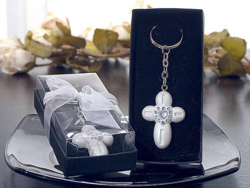 Cross key chains. This stylish resin cross design key chain pearlized white color and accented with a heart shaped stone in the center is attached to a metal ring and key chain. Comes in an elegant black gift with velvet lining finished with an organza ri