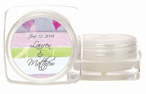 Your guests will love these fun, practical, generously sized lip balm tubs. The tubs are filled with a premium lip balm with SPF 15 protection and a light vanilla scent.The 1.5 round screw-on top fits securely on the base. The soothing balms are composed of Bees Wax and other premium ingredients.These favors can be further personalized with your names and event date along with your choice of one of our premium designs from our extensive design library. You are sure to find a design that perfectly complements your event theme and style. 1.5 round labels. Measurements: 1.75 x 1.75 Square Base, X 0.875 TallScent: VanillaWeight: 1.1 ounces each. Note: Tag or Sticker does not come attached to item. ... This unique & elegant item is part of our exclusive Wedding Favor and Bridal - Baby Shower collection. They make for a great and unique gift for your wedding reception, bridal shower, bay shower or any other special event.