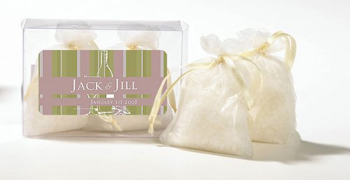 Our unique bath salts are made with the finest ingredients in order to cleanse your skin and provide it with a natural, healthy glow. Our salts are infused with a fresh linen scent to create a refreshing and relaxing environment. Our bath salts packaged in two beautiful organza bags with matching drawstrings. The bags are packaged in a clear PVC box to showcase the product. Elegant Black and White fleur-de-lis design with matching label personalization The personalization of your names and event date will be on a glossy label and applied to the top of the box. Scent : Fresh Linen Contents: 2, 45 gram bags of bath salts Size each bag: 2 L x 1 W x 2 3 4 H. Note: Tag or Sticker does not come attached to item. ... This unique & elegant item is part of our exclusive Wedding Favor and Bridal - Baby Shower collection. They make for a great and unique gift for your wedding reception, bridal shower, bay shower or any other special event.