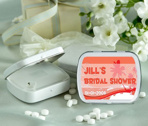 These elegant hinged mint boxes are finished in an attractive gloss white color and are sure to provide a tasty treat for your guests.The tins are filled mints with a refreshing peppermint flavor a real crowd pleaser.The tins are sealed with a clear wrap around the side of the container.Personalize each mint box with your name, event date and an illustration from our extensive design library.You are sure to find a design that perfectly complements your event theme and style. Mints are sugar free Mint Box Size: 2 3 8 long x nearly 2 wide and 5 8 high Weight: 1.4 ounces. Note: Tag or Sticker does not come attached to item. ... This unique & elegant item is part of our exclusive Wedding Favor and Bridal - Baby Shower collection. They make for a great and unique gift for your wedding reception, bridal shower, bay shower or any other special event.