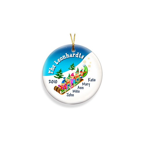 Sled into the holiday spirit with our family of elves ceramic ornament. Select a family of four, five or six and personalize it with all of your elves' first names up to 10 characters per name and the Year. Measures 3" in diameter and includes a metallic gold ribbon for hanging. ... This unique & elegant item is part of our exclusive Wedding Favor and Bridal - Baby Shower collection. They make for a great and unique gift for your wedding reception, bridal shower, bay shower or any other special event.