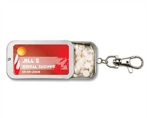 The Detailed Description of Baby Keepsake: Red Beach Theme Personalized Key Chain Mint Tin Favors (Set of 24)