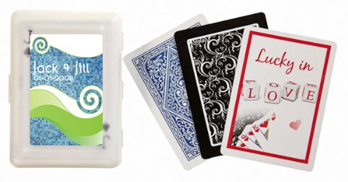 These exclusive design, premium, playing cards are a sure bet to put a smile on your guests faces. Our cards are packaged in a practical, translucent gift box that makes for a pretty presentation for your guests. Choose a design from our extensive design library and personalize the box cards are not personalized with 2-3 lines of text to include your names, event date and if you wish a fun phrase e.g., Perfect Pair, Two of a Kind. etc. Dimensions: Decks measure 2 3 4 x 4 in. Weight: 0.35 lbs each. Note: Tag or Sticker does not come attached to item. ... This unique & elegant item is part of our exclusive Wedding Favor and Bridal - Baby Shower collection. They make for a great and unique gift for your wedding reception, bridal shower, bay shower or any other special event.