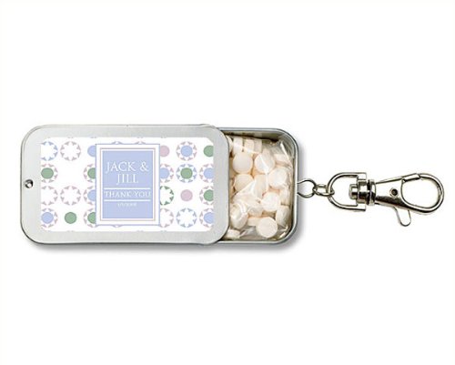 Wedding Favor - Bridal Shower Gift - Baby Shower Keepsake: This beautifully designed keychain mint tin makes the perfect favor ?" these flavorful mints are sure to leave your guests with fond memories of your event. The refreshing mints are packaged in a brushed tin container with a fun and practical key chain attachment along with a tin top that slides open to provide ready access to the mints.Further personalize your gifts with your names and event date along with your choice of one of our premium designs from our extensive design library. You are sure to find a design that perfectly complements your event theme and style. Measurements: 2.75 L x 1.5 W x 0.5 H Flavor: Cool Peppermint, Cinnamint, Refreshing Green Tea. Note: Tag or Sticker does not come attached to item.